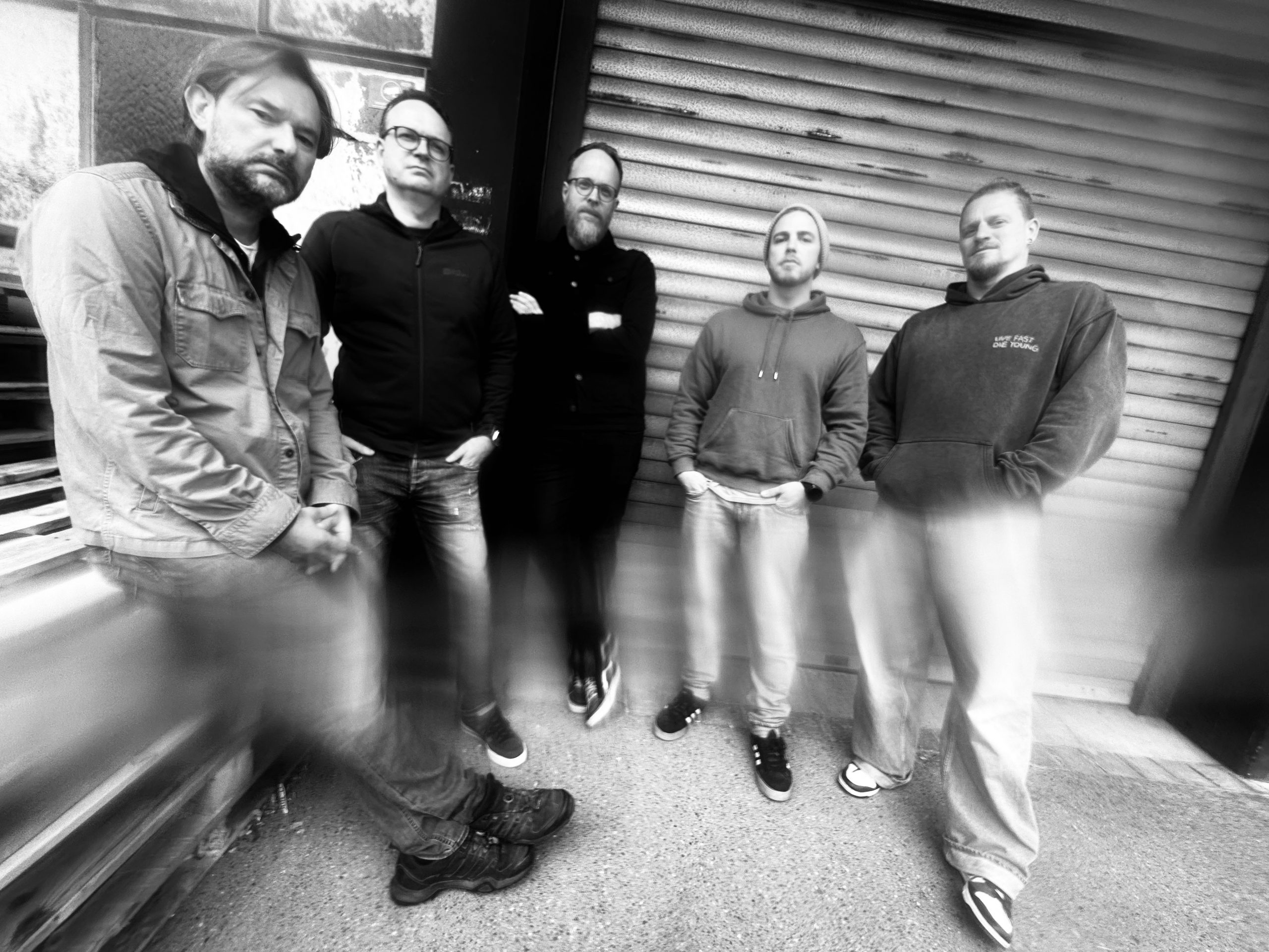 Lose bestuhlt sind Fabian Hauptstock (Gesang), Florian Schüßler (Rhythmusgitarre), Michael Sill (Leadgitarre), Jürgen Fröhlich (Bass) und Uwe Kartmann (Schlagzeug).